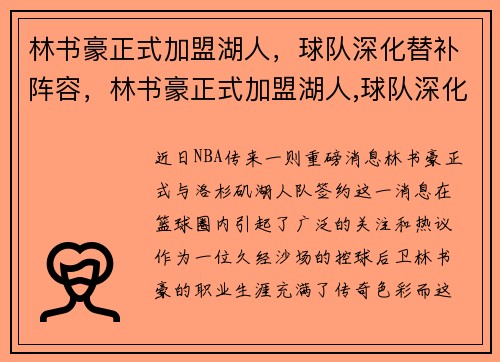 林书豪正式加盟湖人,球队深化替补阵容,林书豪正式加盟湖人,球队深化替补阵容了吗