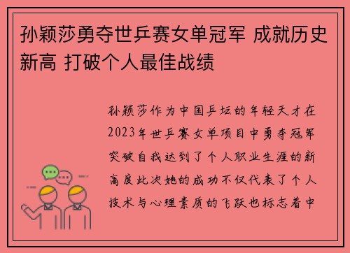 孙颖莎勇夺世乒赛女单冠军 成就历史新高 打破个人最佳战绩