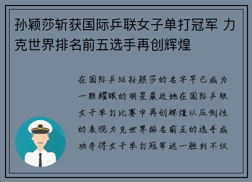 孙颖莎斩获国际乒联女子单打冠军 力克世界排名前五选手再创辉煌