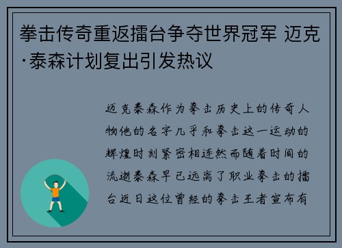 拳击传奇重返擂台争夺世界冠军 迈克·泰森计划复出引发热议